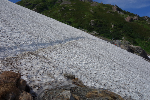 ・大雪渓上部は秋道を利用するようになっています。大雪渓と秋道との行き来はロープに従ってください。秋道は最低限の整備はされていますが、道が悪いので通行に注意してください。(秋道とは雪渓の上を歩けなくなった場合に、山の斜面に迂回路として設けられる登山道のこと)