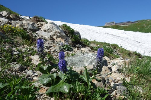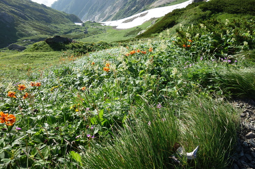 <雪解けの遅いところではウルップソウが咲いていました。村営白馬岳頂上宿舎付近。>