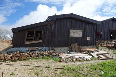 <現在、解体、補修工事中で、小屋内は立入禁止です。左側から雪に押され損傷を受けました。8月3日撮影。>