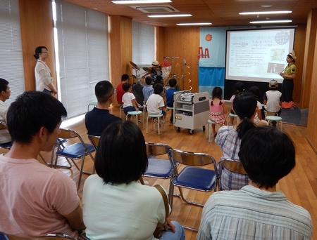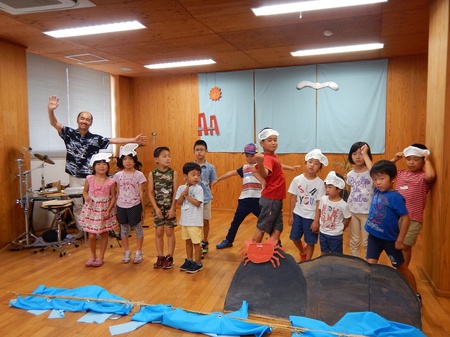 このイベントではパーカッショニストの本多"taco-bow"正典さんをお招きし、藤前干潟にある素材を使って、打楽器をつくり、参加した子どもたちが藤前干潟の生きもの(トビハゼ、ヤマトオサガニ、チュウシャクシギ)になりきって寸劇を演じ、演奏しました。