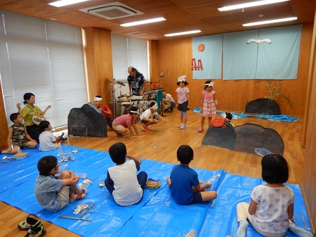 出番を控えている子たちは、taco-bowさんのアドバイスの下、寸劇の展開を見て、打楽器を変えながら演奏します。演奏にはご家族の皆さんにも、スタッフで用意した楽器を使ってもらい、参加して頂きました♪