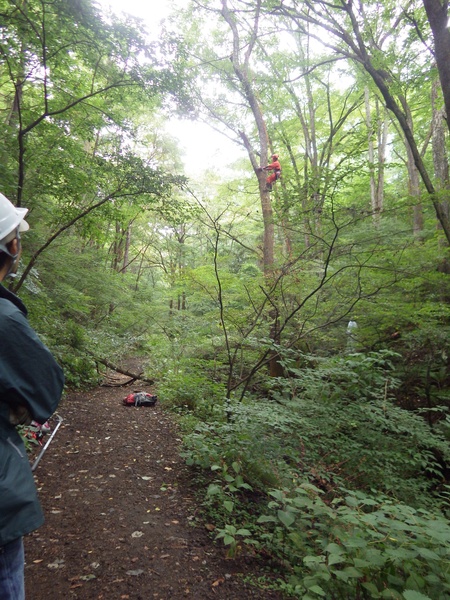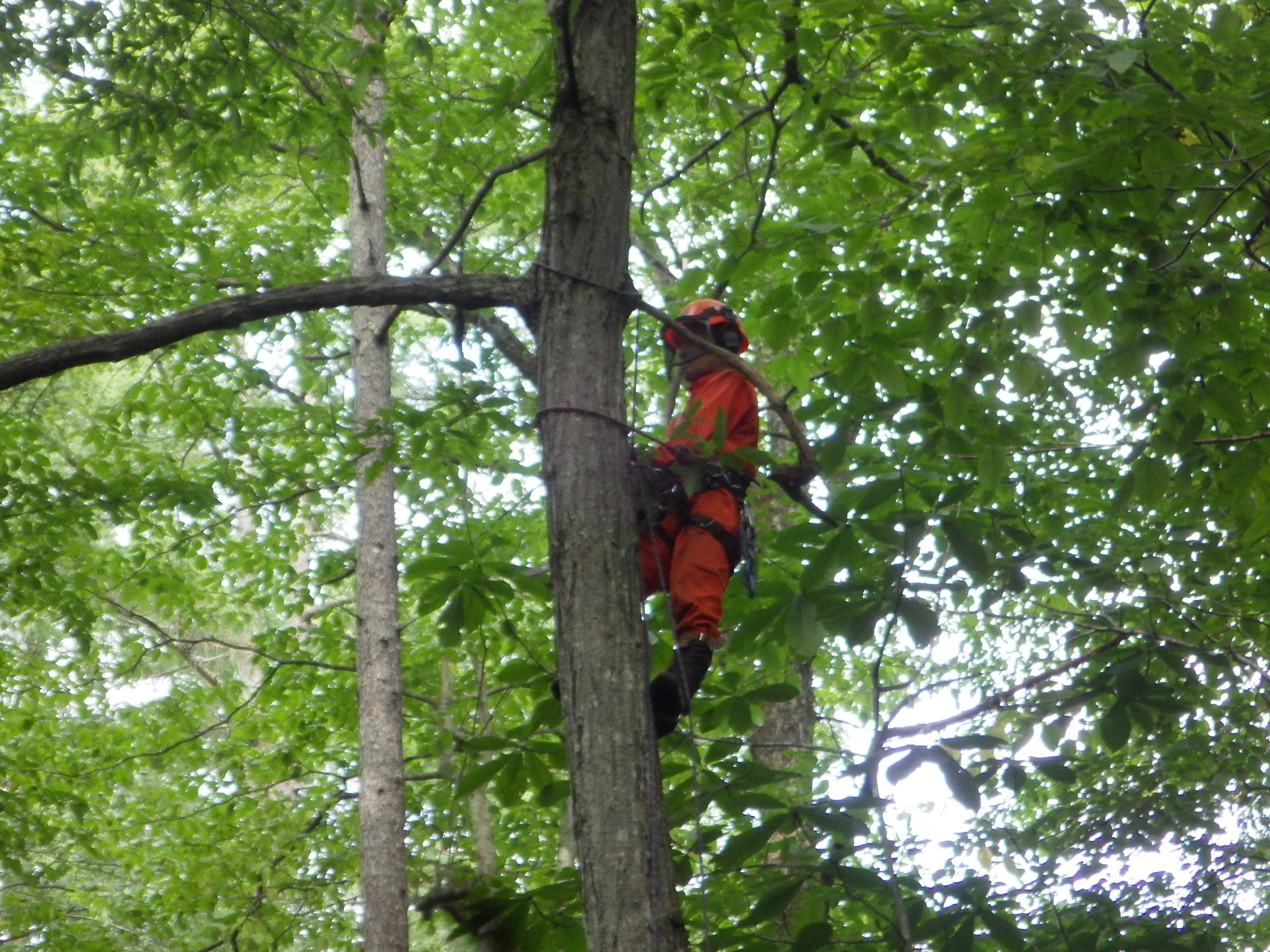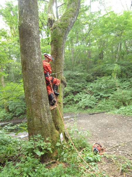 ただ、場所は高所作業車などが進入できない遊歩道沿い・・・そこに救世主が!!身一つで作業が出来るという "空師(そらし)"の水野俊哲さんに作業を行っていただきました。