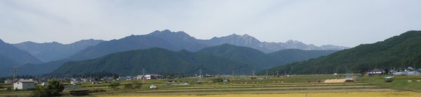 <10月1日、北アルプスの山並みがはっきり見えました。右奥から左に五竜岳、鹿島槍ヶ岳、爺ヶ岳が連なり、さらに左の鳴沢岳、赤沢岳へと連なります。大町市三日町付近の県道から。>