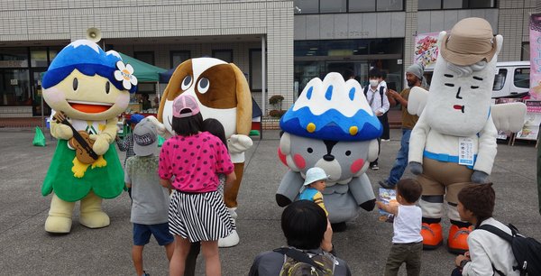 <フェスには近隣市村などのマスコットキャラクターも来ました。左は松本市の「アルプちゃん」、右から2体目が大町市の「おおまぴょん」、右は白馬村の「ヴィクトワール・シュヴァルブラン・村男Ⅲ世」。あなたの推しキャラは?>
