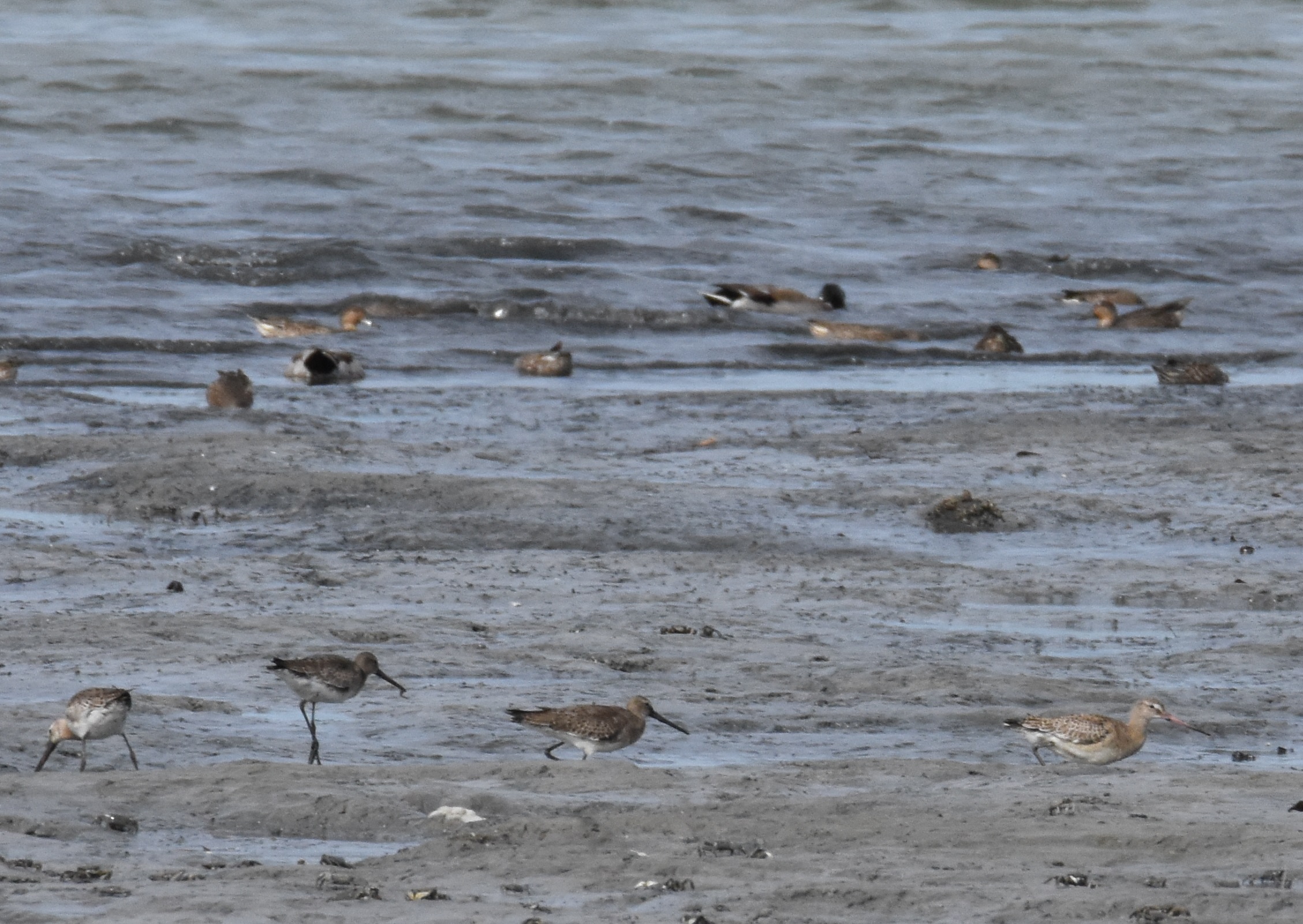<干潟の遠いところにシギチを発見!ピンボケですが、手前側の4羽はオグロシギ。私にとってはオオソリハシシギとの見分けが・・・難しい!>