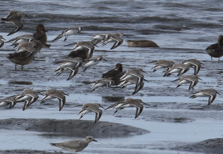 <ちょうど干潟に飛んできたハマシギの群れ>