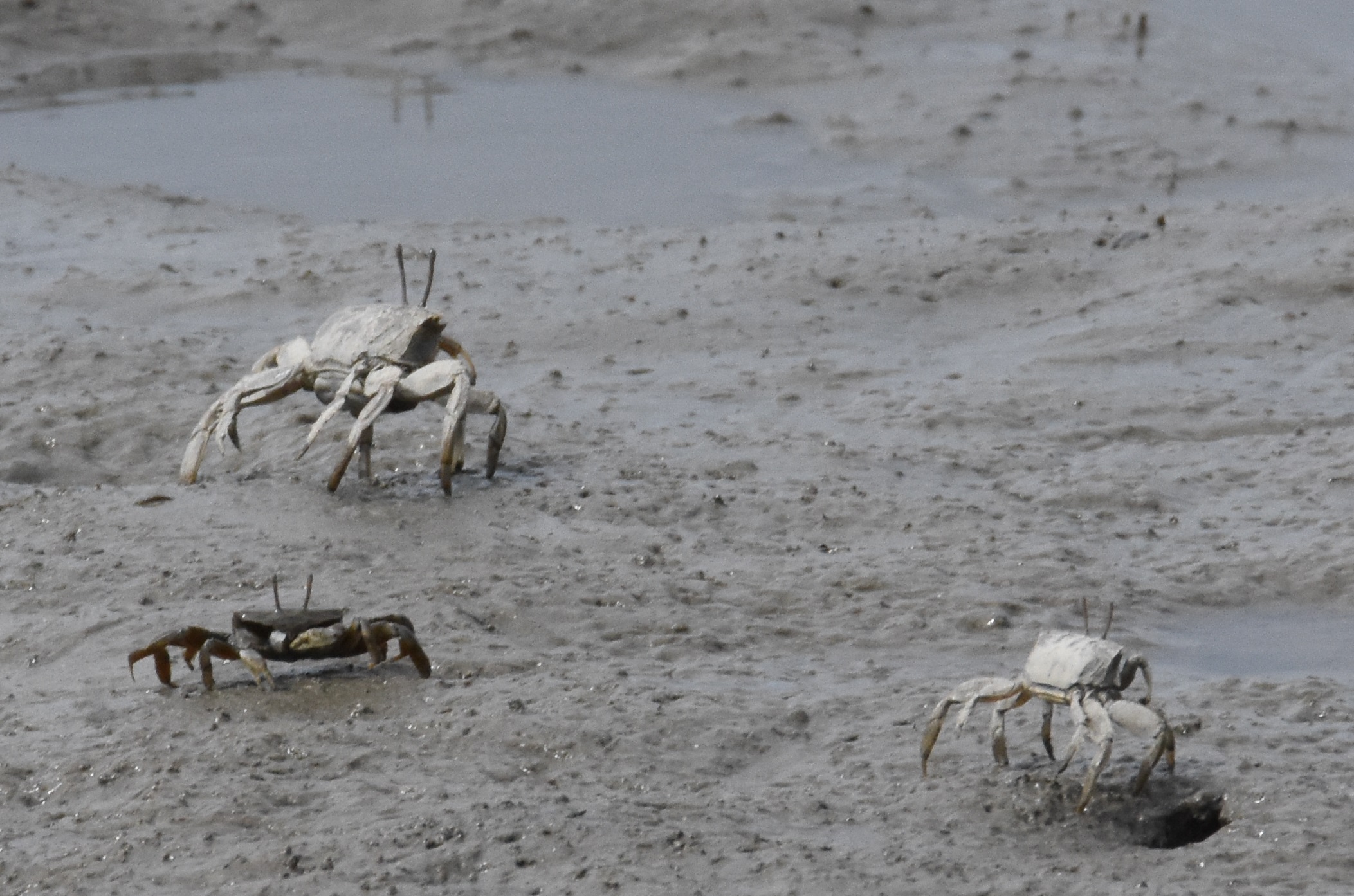 <甲羅干し中のヤマトオサガニ。背は泥がカラカラに乾いて真っ白。干潟に同化していますが、目が慣れてくると沢山のヤマトオサガニを見つけることが出来ます。>