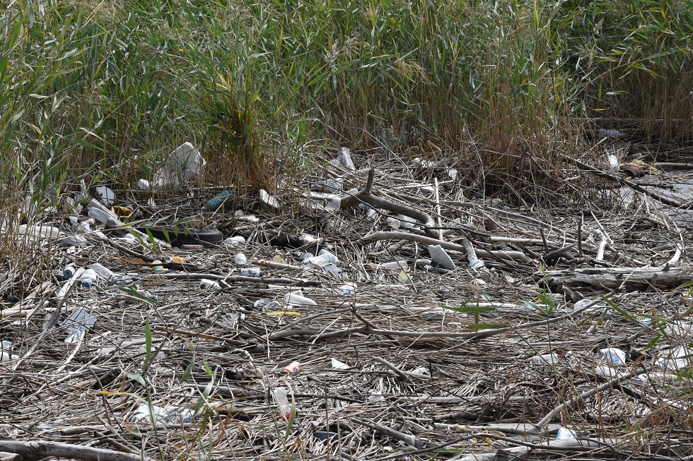 <台風で倒れたヨシの上に枯れたヨシや流木などの自然ゴミとプラスチック製品などの人工ゴミが堆積する>