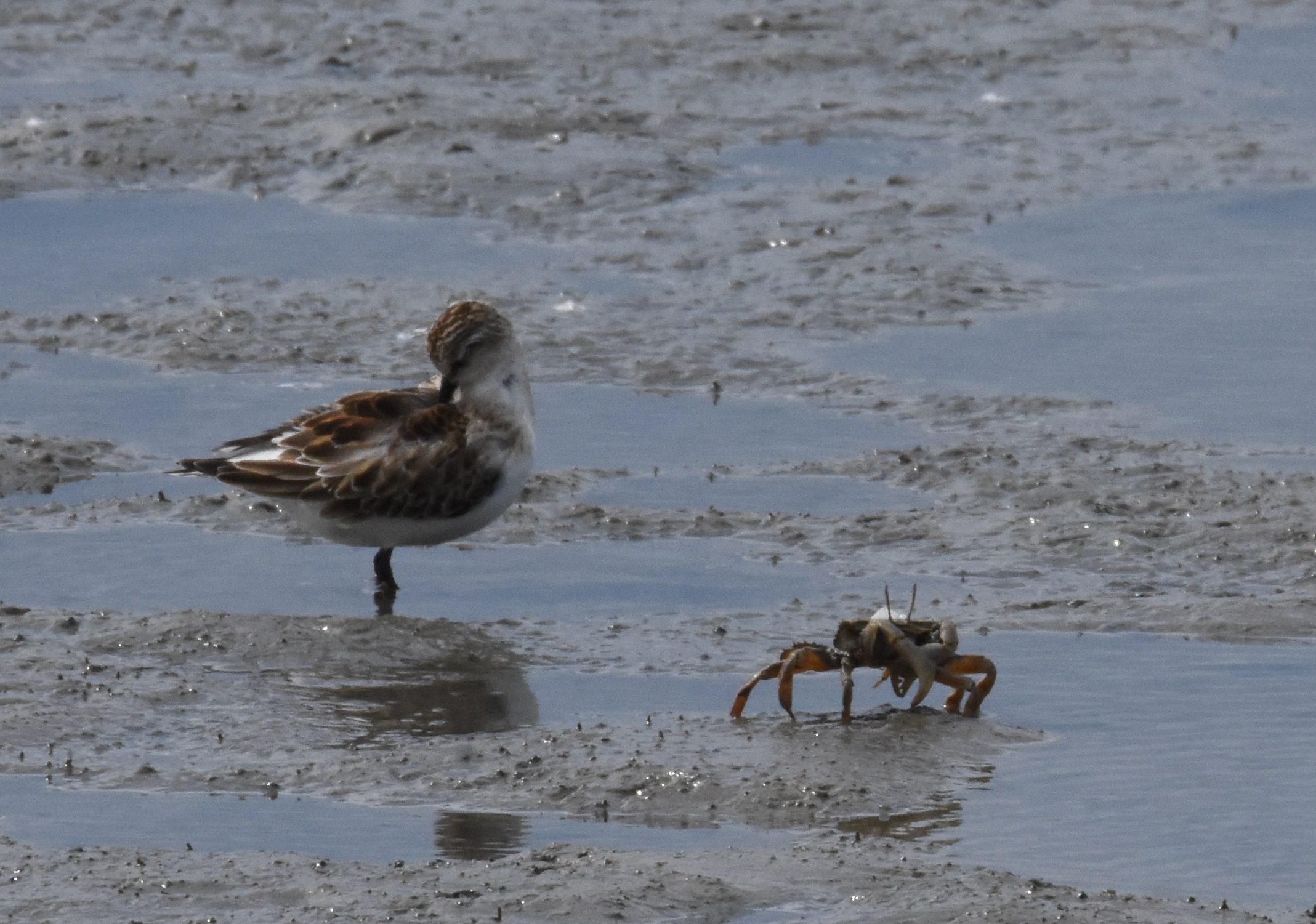 <トウネンとヤマトオサガニ:こうしてみるとトウネンって小さな鳥なんですね。羽繕いに一生懸命でした>