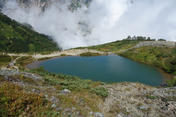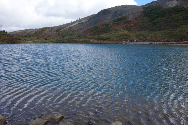<風による波が立っていて、水も濁り気味でした。八方池に写る白馬三山を期待して来られた方には残念な天気でした。>