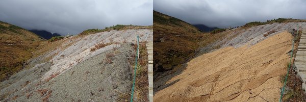 10月10日は八方尾根(長野県白馬村)で、地域の団体が主催する植生回復作業に参加しました。裸地化が進んでいる斜面にマットを敷き、在来の種子を播種することで、植生の回復を促す作業です。