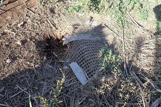夕方、オオミズナギドリは海から島に戻ってきます。あまり減速せずに突っ込むし、障害物を避けるのも上手じゃないようで見ていて冷や冷や。 この様子はまるで「空からの墜落」。 しかも大群で帰ってくるので空は大混雑!鳥同士が接触する「パシンッ!!」という音が時々聞こえましたし、私も頭をかすめられ、髪にオオミズナギドリが触れるのを感じました・・・。着地に失敗して命を落とす個体もあるそうです。ただ、海を飛翔する姿はとても優雅で美しいと聞いています! こんなオオミズナギドリが繁殖する七ツ島ですが、海鳥の楽園なのかと思いきや、実は問題を抱えています。 七ツ島の一つ、大島では、約30年前に持ち込まれたたった2つがいのアナウサギが大繁殖してしまいました。その結果、植物がウサギに食べられて植生が荒廃し、裸地化した(植物が失われ土がむき出しになった)ところから土壌が流出して、オオミズナギドリの巣を壊してしまうなど、繁殖に大きな影響を与えるようになってしまいました。 そこで、平成12年からアナウサギを捕獲するとともに、平成25年からは植生復元(植生を回復させるための)事業が行われています。  (土壌流出を防止し、植生回復を促すために設置されたネット) 最近はアナウサギがほぼいなくなり、ネットの設置によって土壌の流出が抑えられれば短期間で植生が回復するようになっています! 年数回、トイレもお風呂もない無人島に寝泊まりしながら、空から降ってくる海鳥の落とし物にくじけず、照りつける太陽の下、ダニが潜み鳥のフンが舞い散る人の背丈を超える草むらの中で(または寒風厳しい中で)、ウサギ対策や植生復元など様々な保全事業が行われています。 その土地にいない生き物(外来生物)を一度持ち込んでしまうと、想像もしなかったような大きな環境変化が起きてしまったり、その土地にもともといた生き物に深刻な影響を与えてしまうことがあります。さらに、変化してしまった環境を元に戻すのには大変な労力と時間がかかりますし、場合によっては元に戻すのが難しいこともあります。