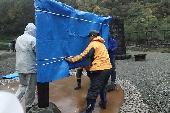 なお、白山では白山室堂や南竜山荘などの山小屋は営業を終了しています。 10月21日(土)には白山国立公園パークボランティアの皆さんと、別当出合(石川県白山市)の駐車場や園地などで看板等を積雪から守るため、ブルーシートで覆ったり、撤去したりする作業を行いました。  (積雪に備えブルーシートで覆われた看板。10月21日撮影) この他の施設も冬季閉鎖の準備が各地で進められており、水場やトイレが利用できないことがありますのでご注意ください。