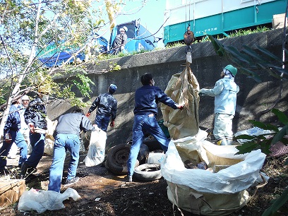 堤防下では各自でゴミを集め、可燃・不燃・粗大ゴミに分別し、フレコンバックに詰めて、これを重機で運び出します。この場所は人が簡単に入れる場所ではないので、こうした重機でないとゴミを運び出すのも一苦労です。