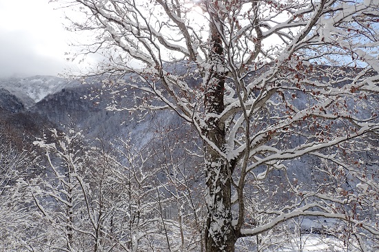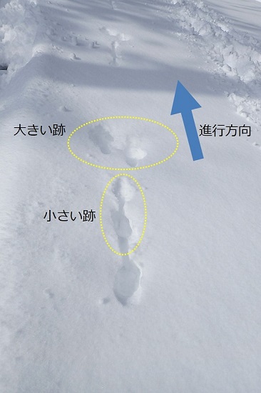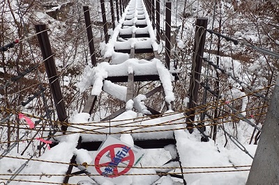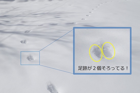 この写真の足跡は2個ずつそろってついていますが、このようなとき、テンはシャクトリムシのように体を動かして走っています。これはちょっと走っているときの体の動かし方になります。 つまり、この足跡の主はちょっと急いでいたようですが、全力疾走するほどでもなかったようだ・・・ということがわかるんですね。足跡を見るとその主の様子を想像できるって、とっても面白いですね♪ こんな風に雪の山では夏とは違った発見があります。 雪のある山は軽い気持ちで入るととても危険なので注意が必要ですが、冬ならではの自然を楽しめます。冬が深まれば白山山麓で観察会が開催されたりするので、そのような機会に是非、冬の自然を味わいに遊びに来てください♪ ** ご注意 **************************** 白山は既に冬山です。冬山は十分な装備と経験が必要です。 また、別当出合の吊り橋は、冬期養生のため板が外されており通行できません。
