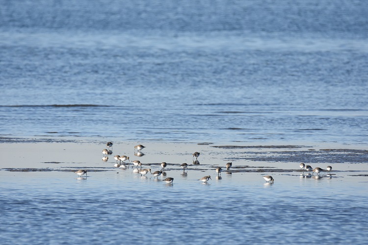 少し遠目ですが、ハマシギの採餌風景。忙しそうに、干潟表面をつついています。1000羽近くのハマシギが飛来しています。