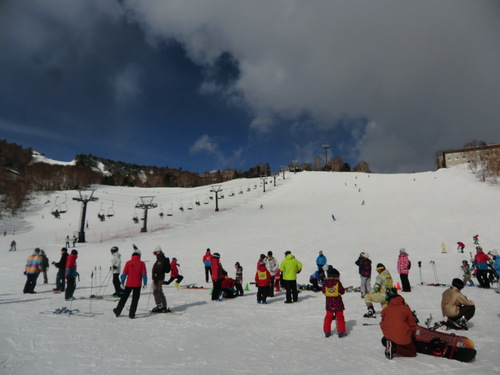 【万座温泉スキー場でスキーやスノーボードを楽しむ観光客】