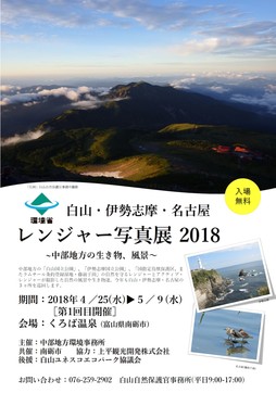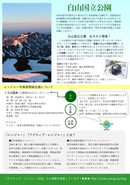 この写真展は「白山国立公園」、「伊勢志摩国立公園」、「国指定藤前干潟鳥獣保護区」で活躍するレンジャーやアクティブ・レンジャーが、現地で撮影した写真を展示するものです。各地域を巡回展示するのですが、今年度最初は白山地域での開催となります♪ 今回は、南砺市と共催で、上平観光協会の協力、白山ユネスコエコパーク協議会の後援をいただき、地域の皆さまのご支援で開催できることになりました♪  (レンジャー写真展のチラシ。クリックすると大きな画像が見られます。)