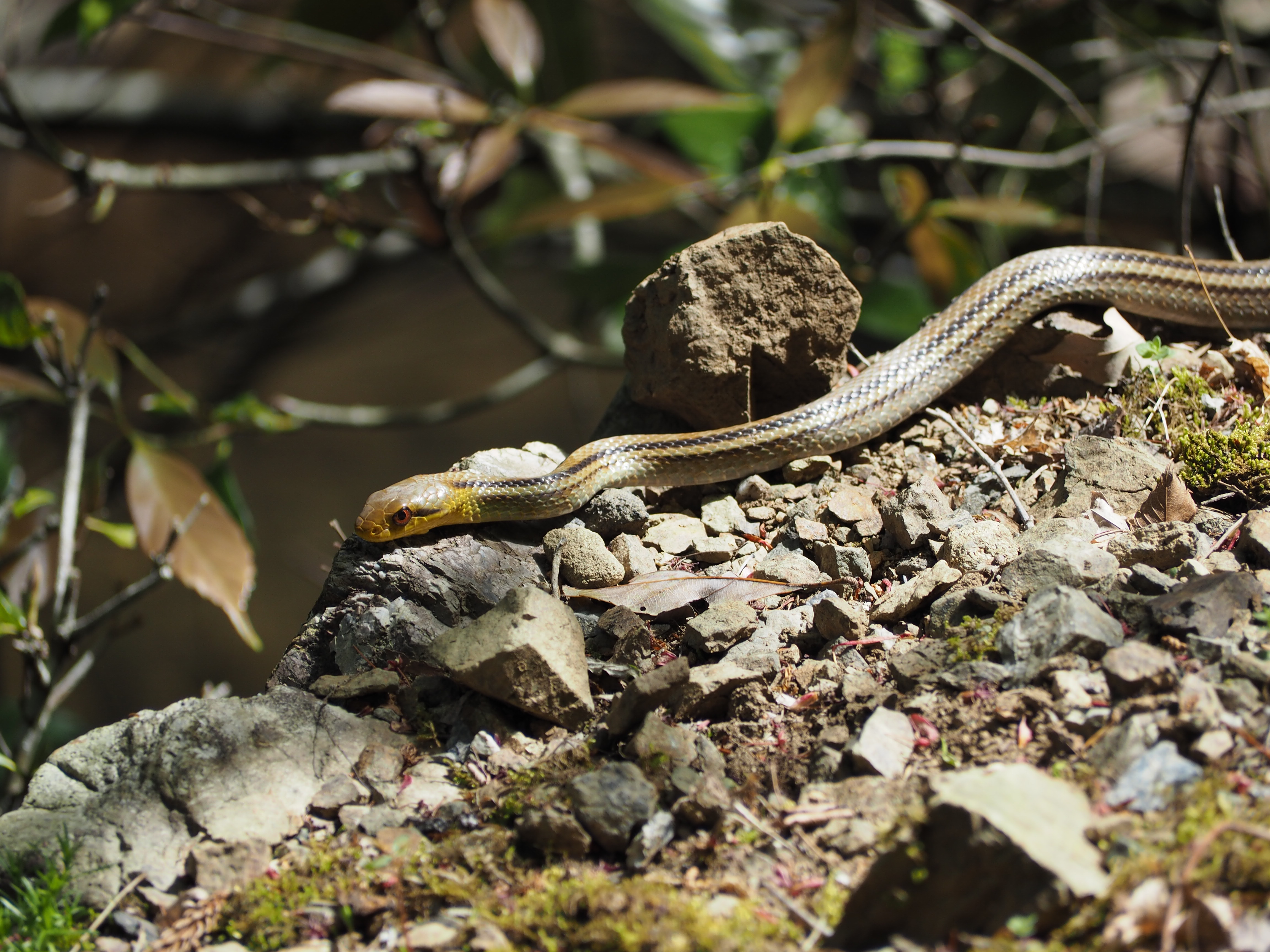 川の石垣の上にはシマヘビが日光浴。ぽかぽか陽気で、気持ちよさそうです。