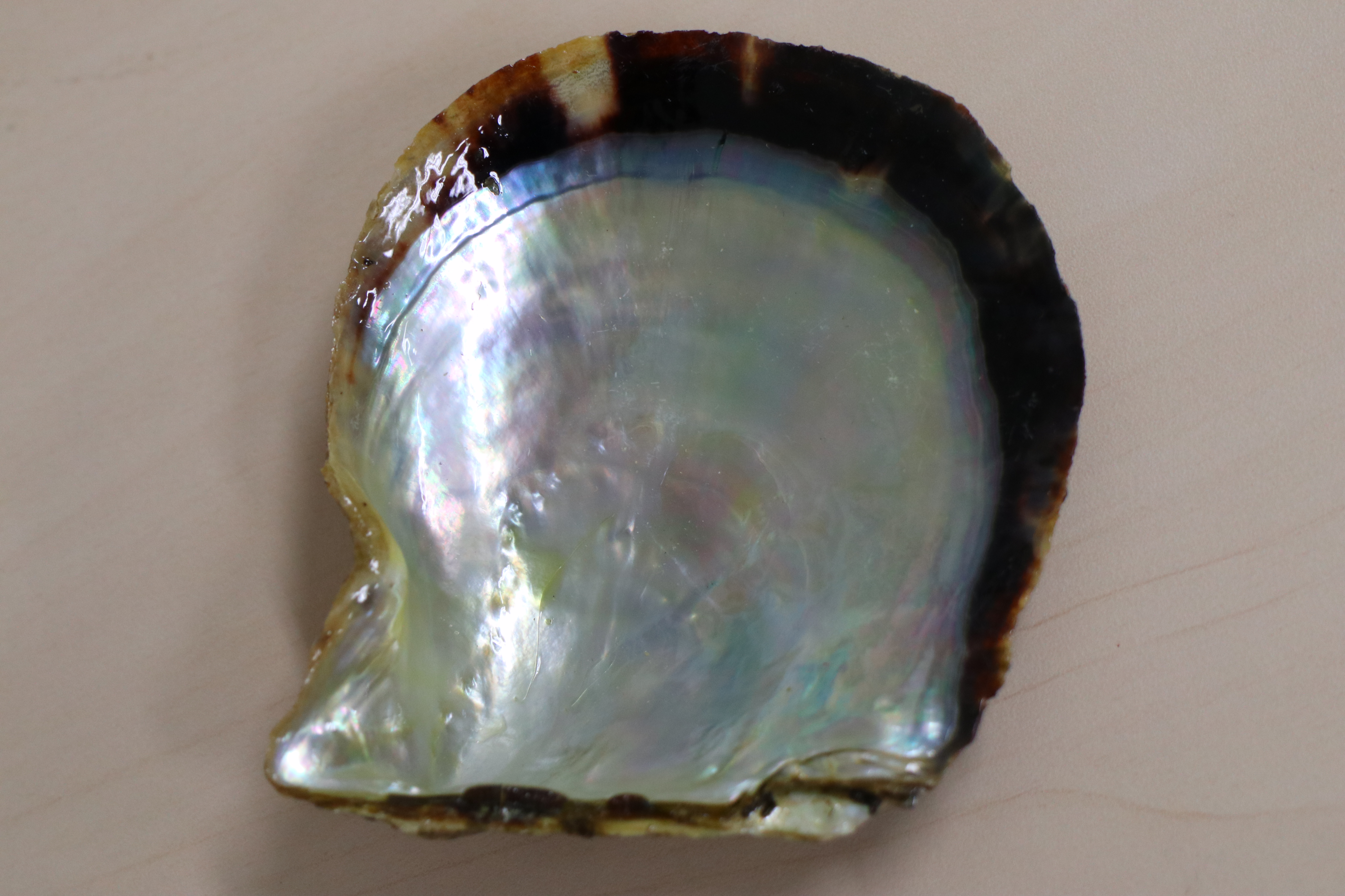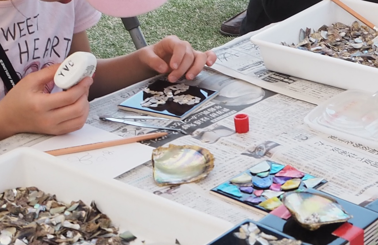 今年は横山ビジターセンターの方のアイディアで、アコヤ貝を使った「螺鈿細工」のクラフト体験を行いました。