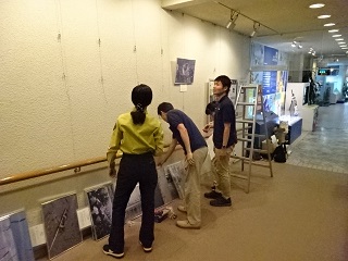 <写真左:会場設営の様子。施設の職員さんも手伝ってくれました!、写真右:写真展の様子。写真の他に藤前干潟のパネルも展示しました!>