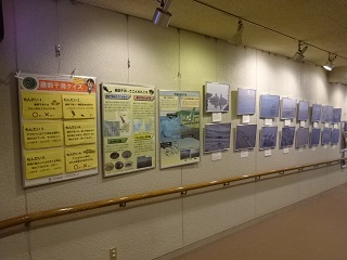 この施設は、水族館エリア(有料)と科学館エリア(無料)があり、1日楽しむことが出来る場所です。今回は、ロビーから科学館エリアのほうへあがっていくスロープの壁面で展示させていただくことになりました。