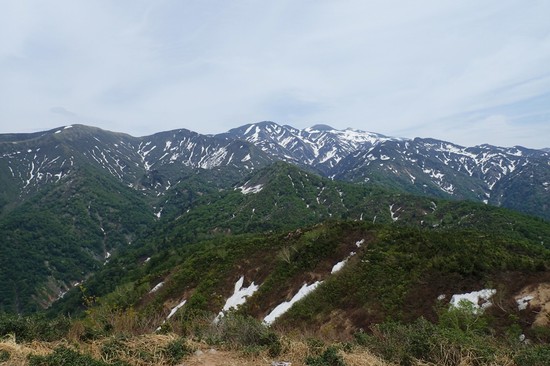 (白山の様子。中央一番奥が白山大汝峰と御前峰。5月29日鳴谷山から撮影)