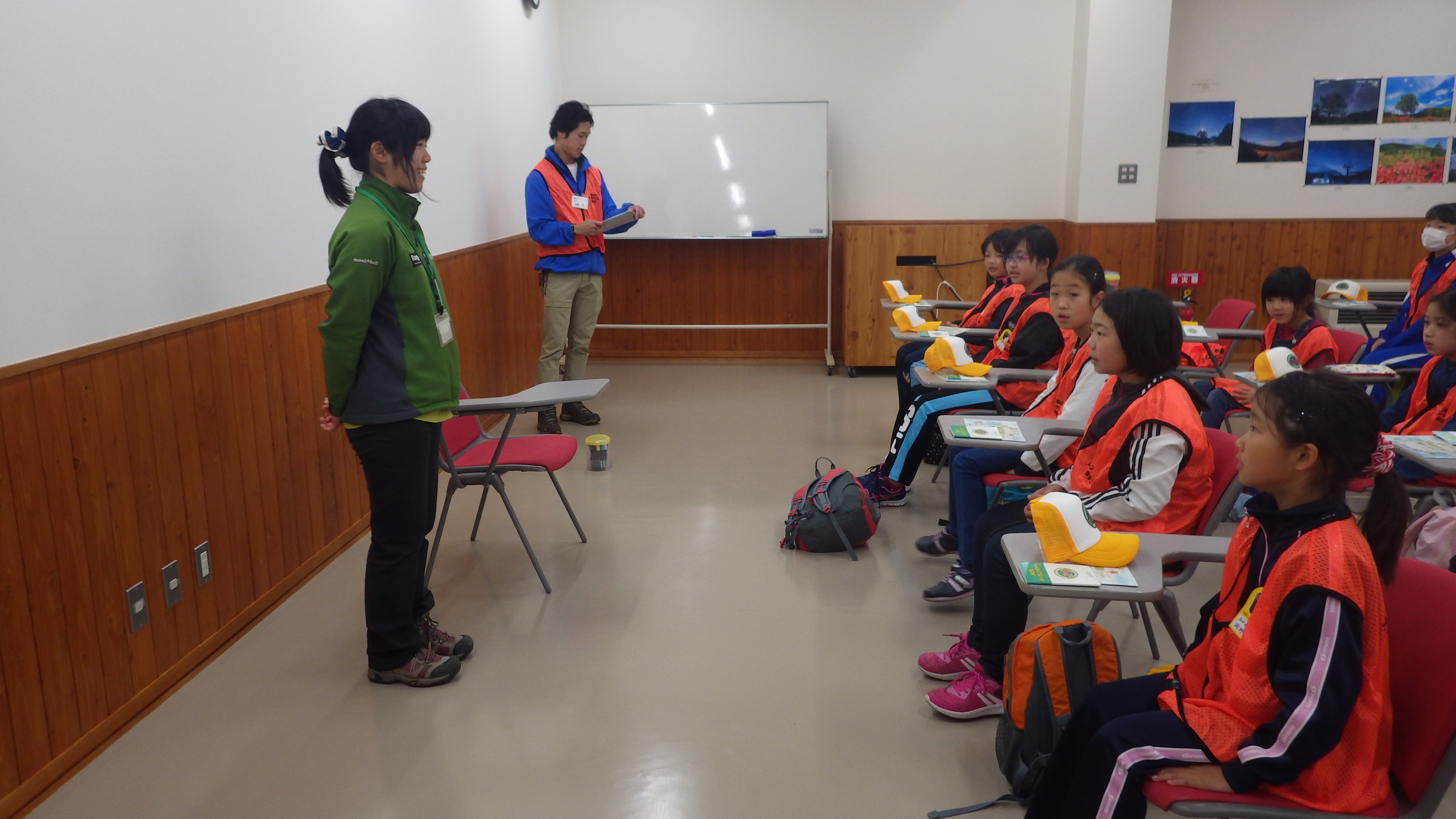 環境省レンジャーから国立公園についての話を聞き、1人ずつ自己紹介をした後、湯の丸の自然を守る「子どもパークレンジャー」として任命されました。