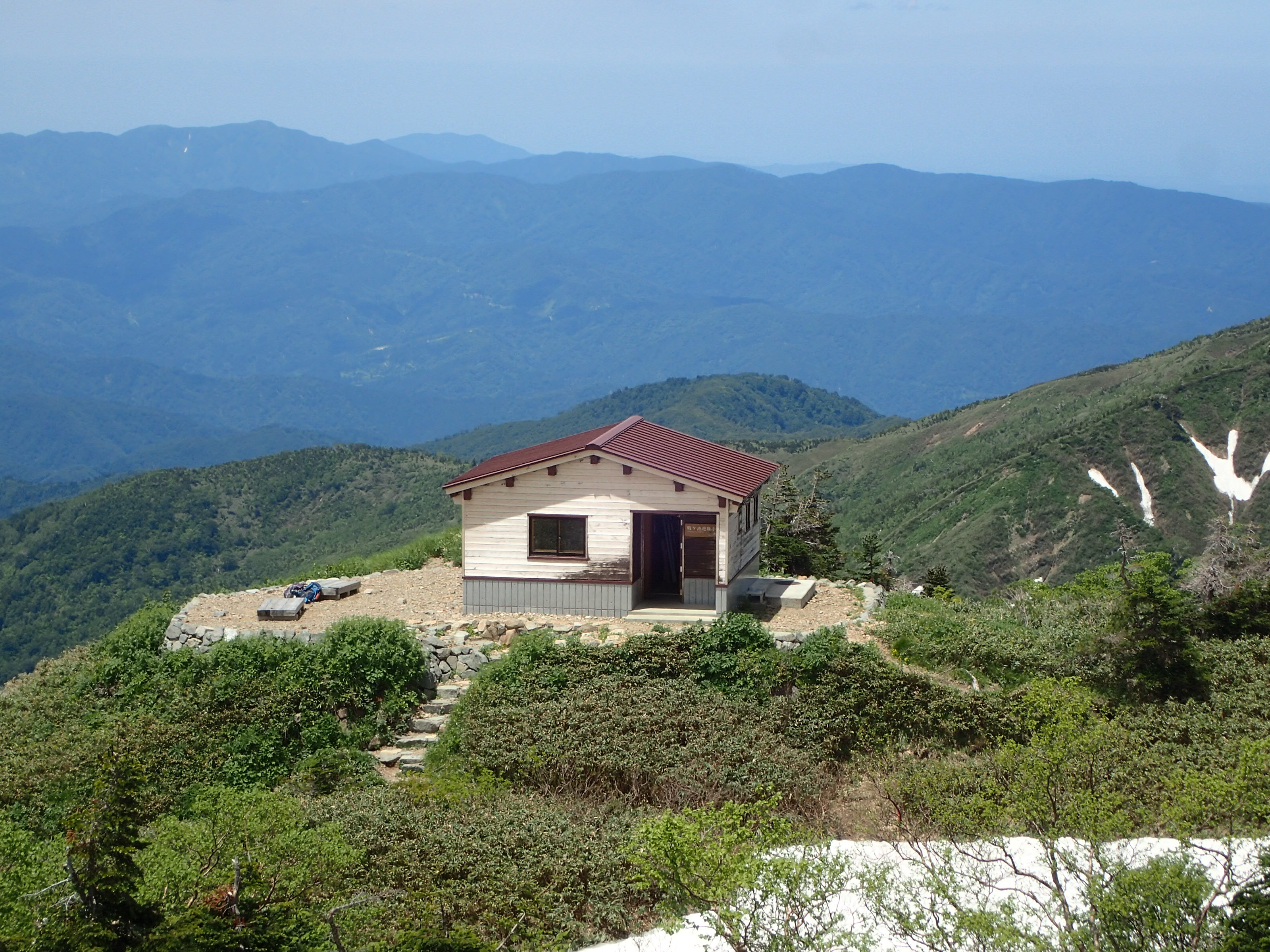 殿ヶ池避難小屋に到着です。小屋の周辺はまだ雪が残っていますので滑落や道迷いにご注意下さい。