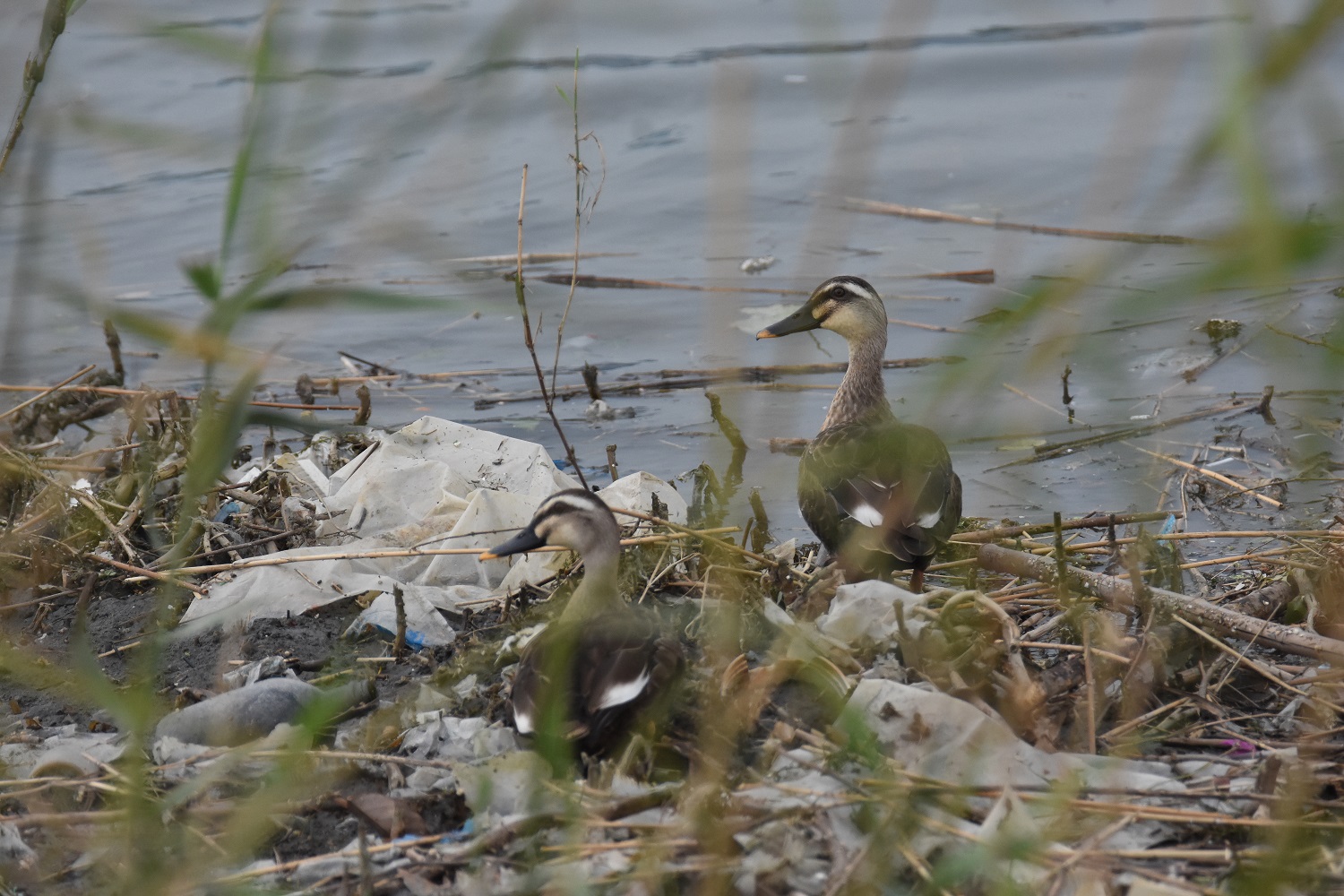 <9月6日:漂着ごみの横で休息するカルガモ>