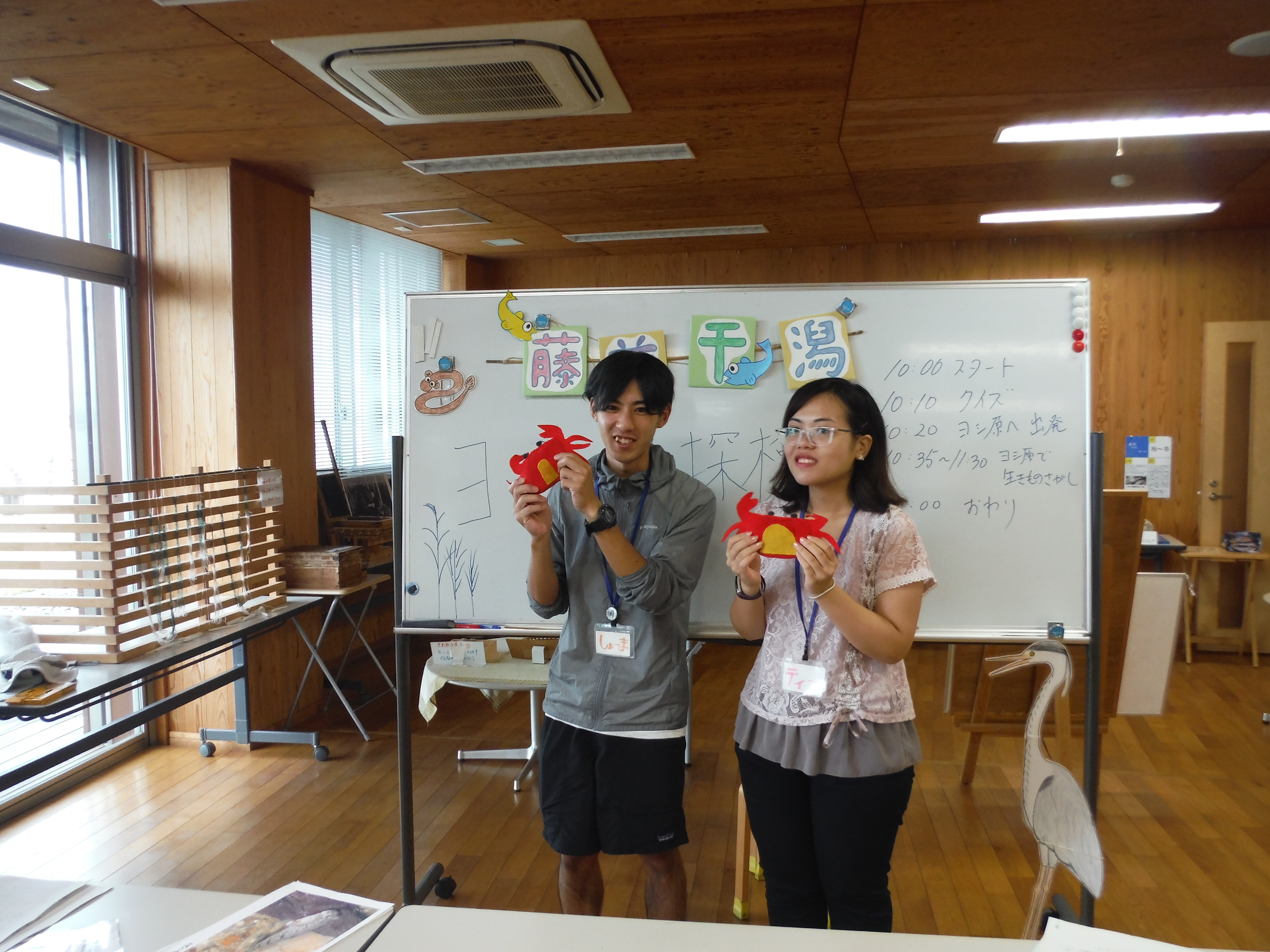 <最初にスタッフより、カニのつかみ方など、小物を使った楽しい説明がありました。>