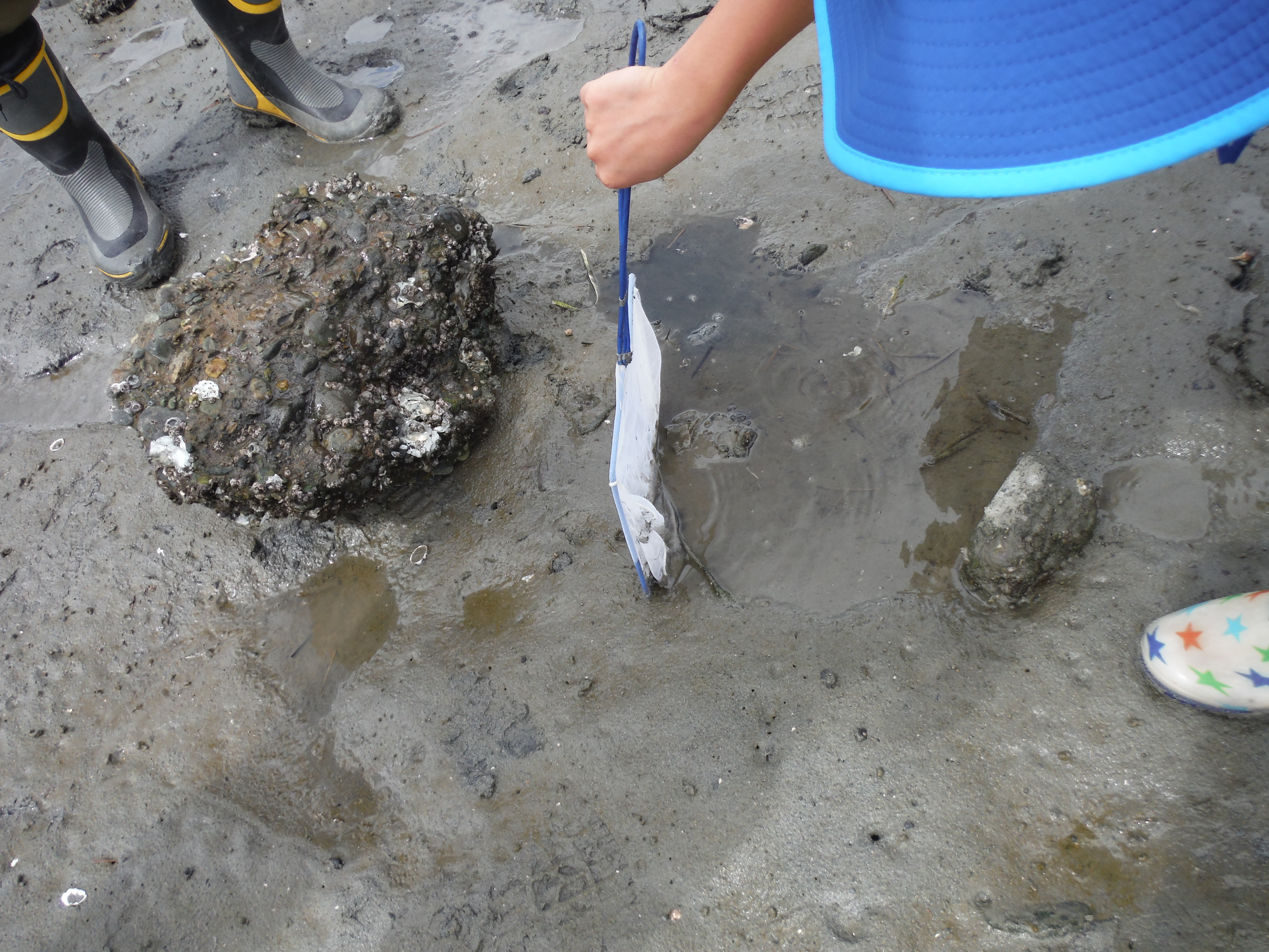 干潟に入ると夢中で生き物を捕まえていました。岩をひっくり返すと、カニがたくさん。