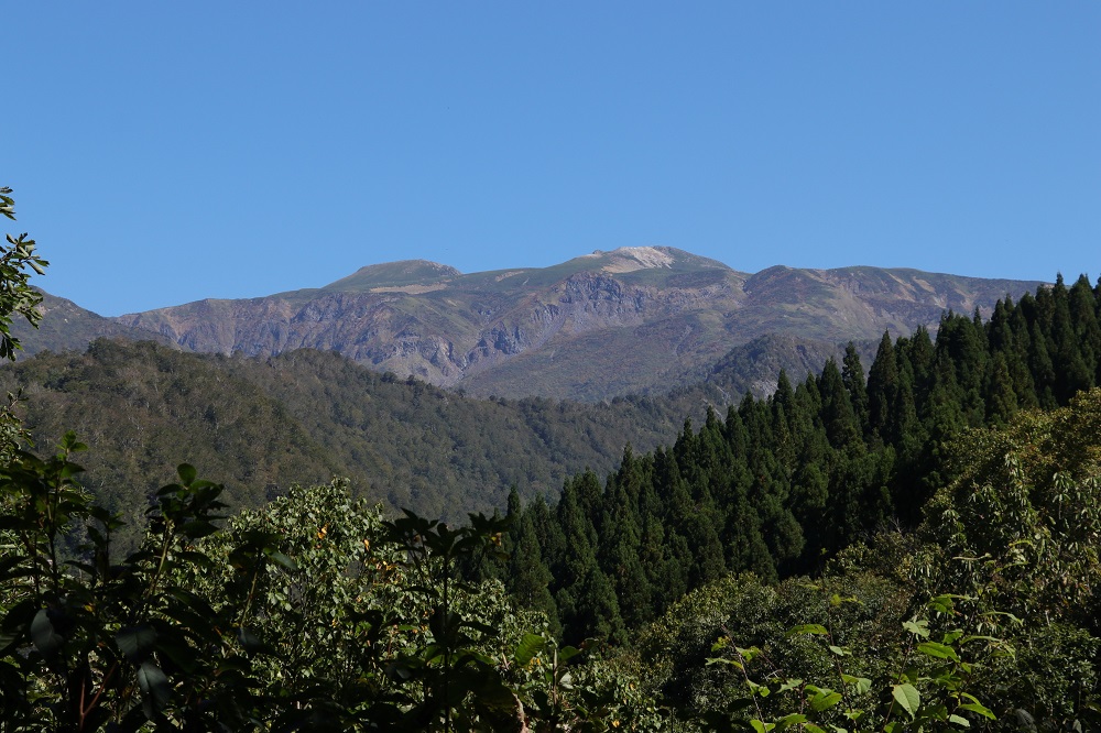 みなさん、こんにちは。 この夏は暑い日が続いたかと思ったら、次は雨雨雨・・・。8月下旬からは予定していた行事がことごとく雨天や台風接近で中止になり、私には心のビタミン白山が不足した日々が続いていました。 しかし、ようやく秋晴れのもとでくっきりと白山を見られる秋らしい日に出会えるようになってきました!  (秋晴れの白山。岩屋俣谷園地の白山展望台で10月3日撮影) 山頂付近はもう秋も終わりという様子ですね。
