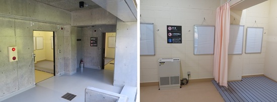 コーヒーなどをボトルに入れて持参して、デッキチェアでゆっくりくつろぐ。 私がやってみたいことリストに加わりました♪ あ、これからの季節、ブランケットもあると良さそうですね。 このデッキチェアは、10月13日(土)の午後に本設置される予定です。 皆さま、ぜひご利用ください♪ また、この施設には、屋外の階段を下りると地下1階に更衣室もあります。登山の前後に着替えが必要な方は、こちらをご利用ください。  (左:更衣室の入り口付近。右:更衣室の中の様子。こちらは男子更衣室) なお、市ノ瀬休憩所の開放時間は、8時45分~17時までです。 夜間は施錠するので、施設内に忘れ物をなさいませんようお気をつけください。