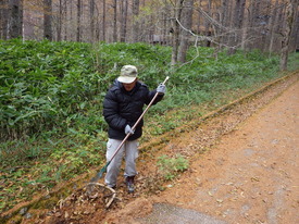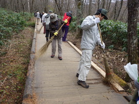 この時期は、遊歩道に落ち葉が積もります。積もった落ち葉が濡れると滑りやすくなることや、そのままにしておくと木道が痛みやすくなるので除去します。