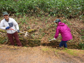 【側溝の落ち葉除去様子-落ち葉や土を取り除くのは大変です】