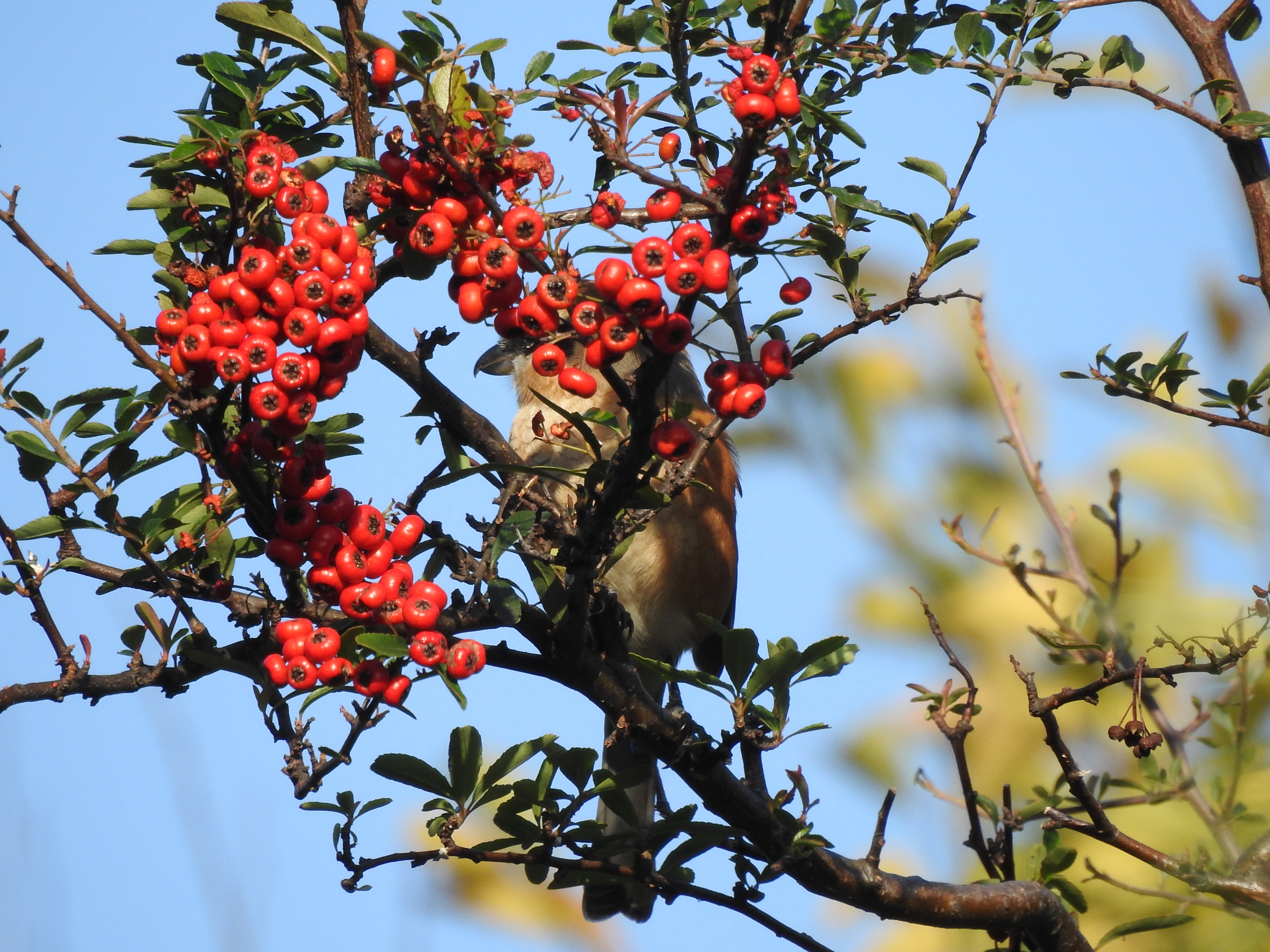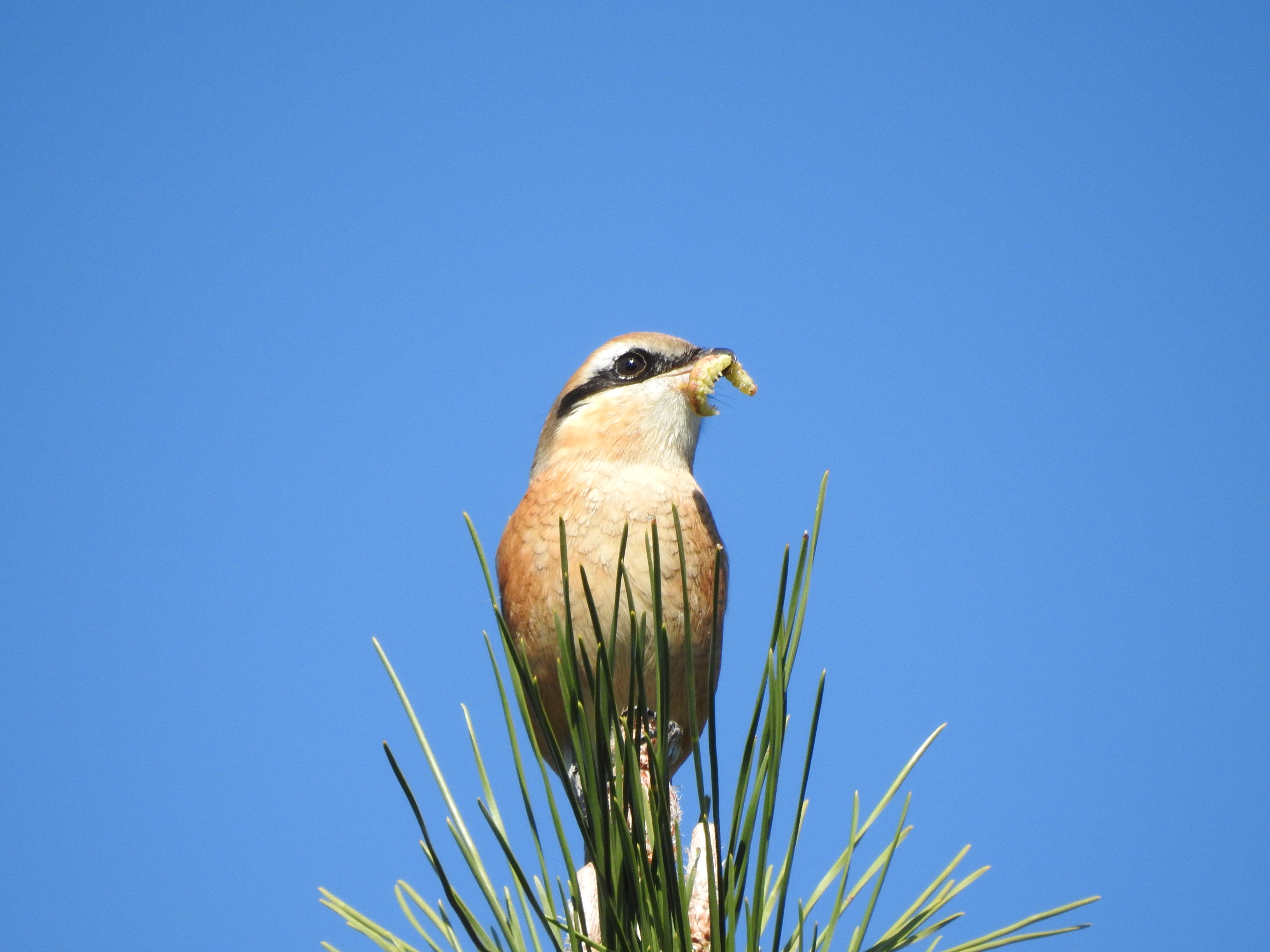 モズです。漢字では「百舌鳥」と書きます。様々な鳴き声で囀(さえず)るため、その名の由来となっています。モズは肉食で主に虫などを食べます。こちら!! 苦手な方はごめんなさい。