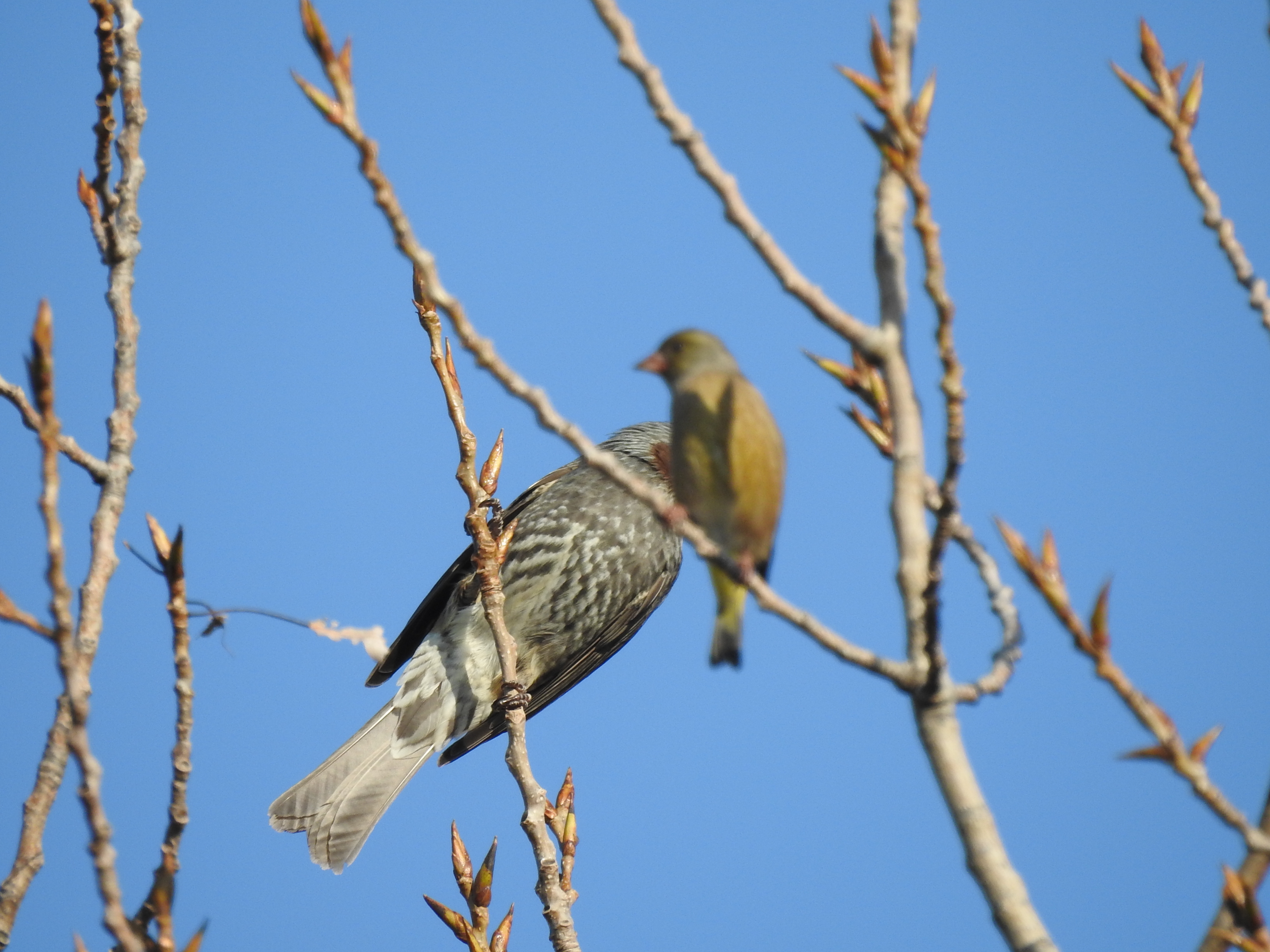 <ヒヨドリが近くに来て気になる様子のカワラヒワ> <迷惑そうなカワラヒワ>