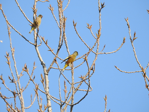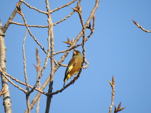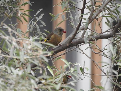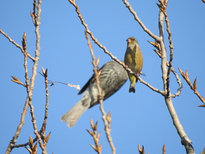 せっかく気持ちよく止まっている所に度々ヒヨドリが飛んで来て、カワラヒワは迷惑そう・・・