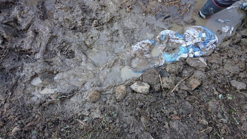 溝に土嚢、そして隙間に土や泥を詰めていきます。