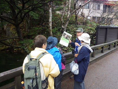 上高地のサルの生活も伝えます。ときには道案内や山や花の名前も。