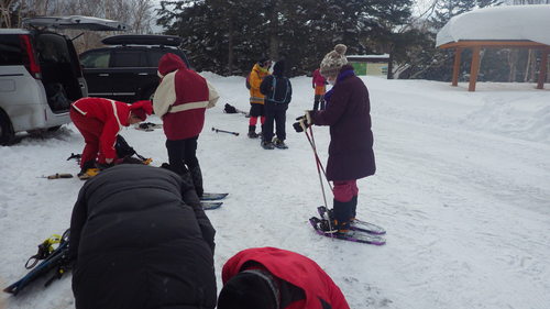 まずはスノーシューをはくところからスタート。