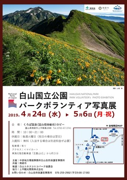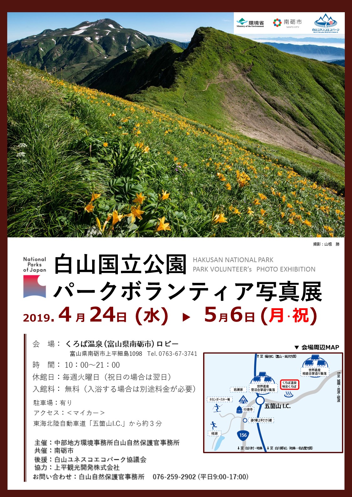 皆さん、こんにちは。 平成から令和へ時代が変わるゴールデンウィーク。ご予定はもうお決まりですか? 白山国立公園とその周辺では春の訪れや新緑を満喫できる季節になっています♪ ゴールデンウィークは白山国立公園とその周辺へお出かけしませんか? 富山県南砺市五箇山地域にある「くろば温泉」では、ただ今「白山国立公園パークボランティア写真展」を開催中です。 南砺市さんと共催、白山ユネスコエコパーク協議会さんの後援、上平観光開発株式会社さんの協力をいただいています♪  (4月23日の写真展準備。作業は南砺市職員の方とパークボランティアの方と一緒に行いました!) ***【白山国立公園パークボランティア写真展2019】*********** 会 場: くろば温泉 ロビー 富山県南砺市上平細島1098 Tel. 0763-67-3741 時 間: 10:00~21:00 休館日:毎週火曜日(祝日の場合は翌日) 観覧料: 無料(写真展観覧のみの場合は無料。入浴する場合は別途料金が必要) 主 催: 環境省 中部地方環境事務所 白山自然保護官事務所 共 催: 南砺市 後 援: 白山ユネスコエコパーク協議会 協 力:上平観光開発株式会社 ※ 写真展やパークボランティアについてのお問合せは白山自然保護官事務所まで : Tel. 076-259-2902(平日9:00~17:00) チラシはコチラ ▼ 白山国立公園パークボランティア写真展2019_チラシ(くろば温泉).pdf
