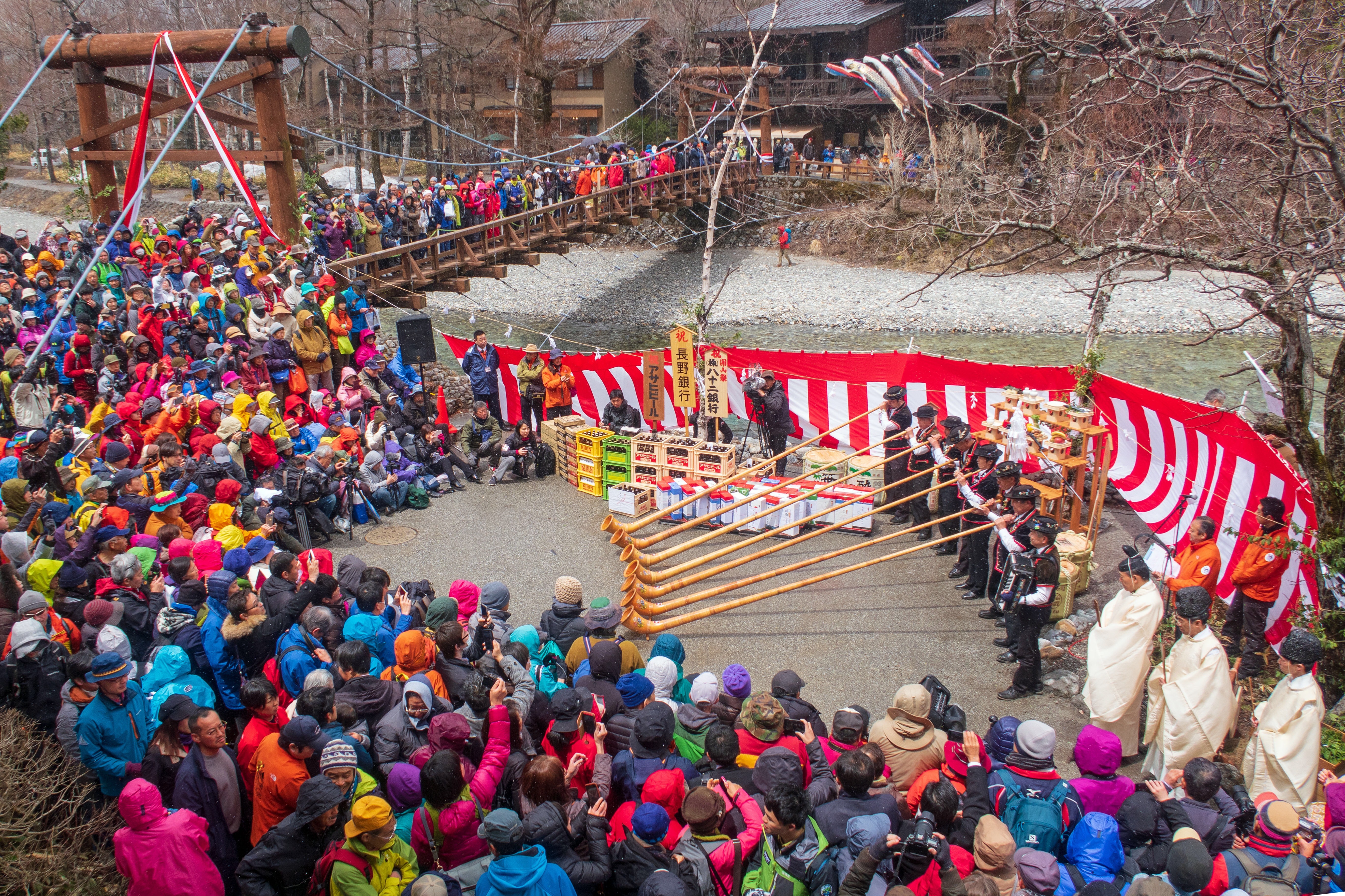 この日は雪が舞い、時折強く風が吹くという春の上高地ならではのお天気となりました。この開山祭は例年4月27日と日が決まっていますが、今年は偶然平成から令和に変わる超大型連休の初日にあたったということもあり、上高地はたくさんの方で賑わっていました。