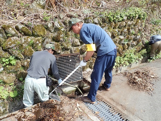 しかも水を含んでかなり重い! 鋤簾(じょれん)やスコップを使ってかき出します。  (ここは力自慢の猛者達が大活躍!!) お陰様でとてもきれいになりました。  (清掃後の集水升)