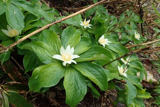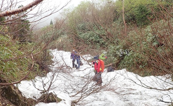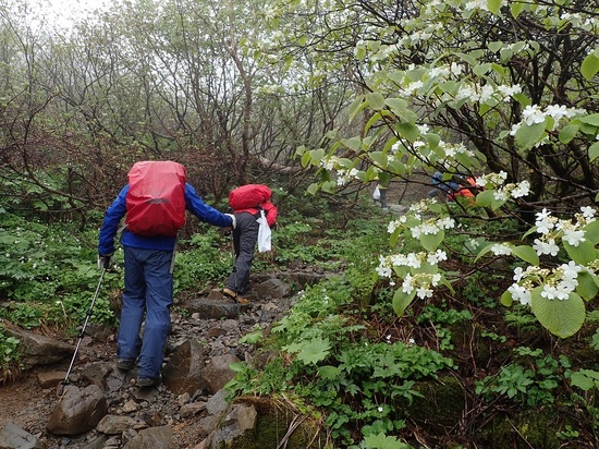 レインウェアを着込み、甚之助避難小屋へ向かいます。 しかし、パークボランティアの皆さんは、雨であっても道中を楽しむことを忘れません。オオバミゾホオズキの黄色い花、イワナシのピンク色の花、キヌガサソウの大輪の白い花などを楽しみながら登りました。