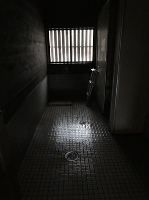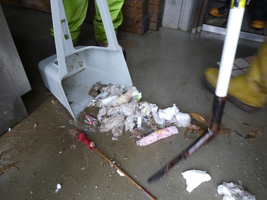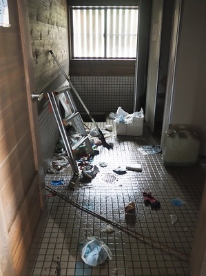 中に入って唖然...。 誰かのゴミが放置されていた上、そこに動物が侵入して荒らしたようで、保管されていたトイレットペーパー等も含めて散乱し、天井からの雨漏りも相まって、床はゴミや何やらでぐちゃぐちゃ...