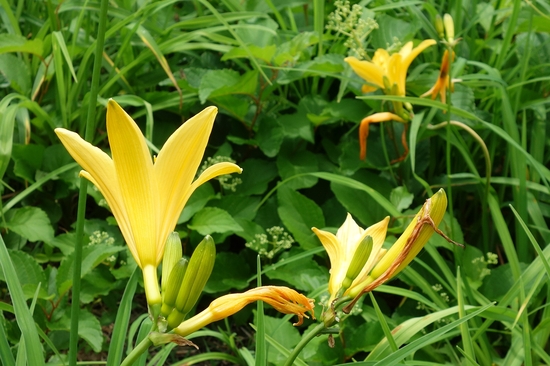 <ニッコウキスゲは花が複数あり順々に咲いていくので、一つの株で長い期間花が咲いています。この写真でも、しおれた花と開いた花と複数のつぼみを見ることができます。>