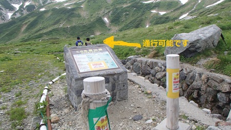 室堂山荘側からの代替歩道の入り口は少しわかりづらいのですが、一の越・雄山方向へ向かう登山道の途中にあります。大きな看板が目印です。