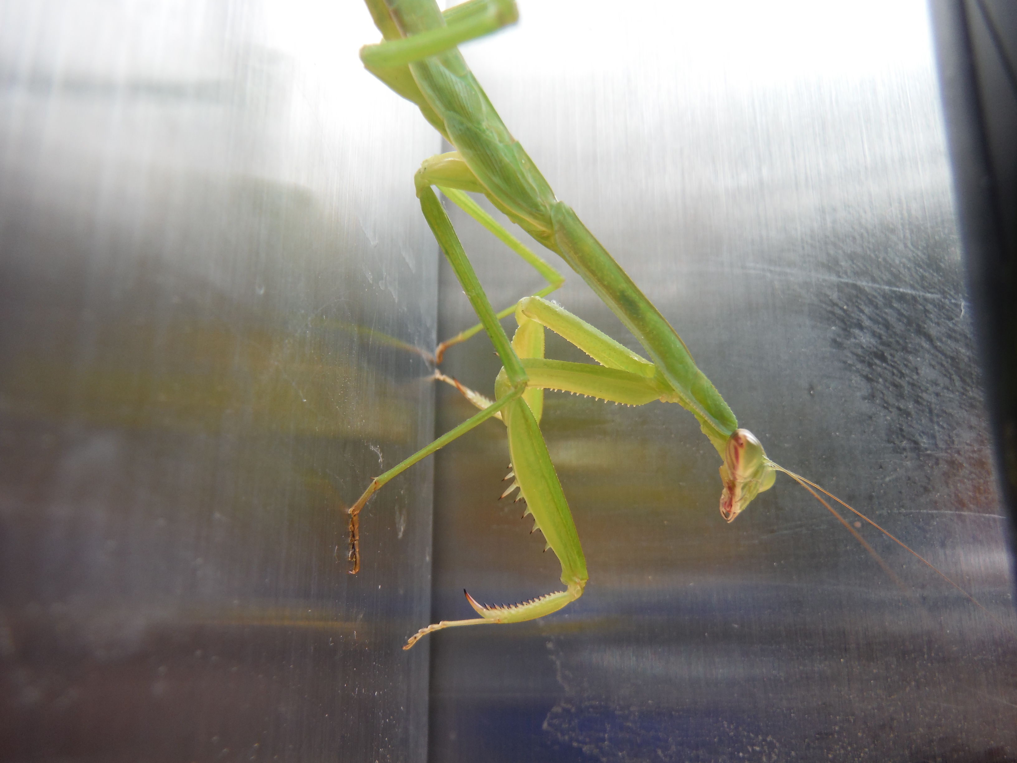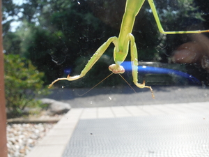 <ビジターセンターの中をのぞき込んでいるカマキリ>